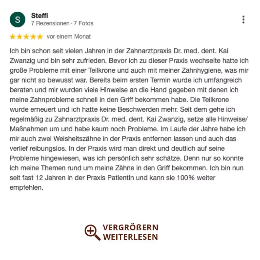 Ich bin schon seit vielen Jahren in der Zahnarztpraxis Dr. med. dent. Kai Zwanzig und bin sehr zufrieden. Bevor ich zu dieser Praxis wechselte hatte ich große Probleme mit einer Teilkrone und auch mit meiner Zahnhygiene, was mir gar nicht so bewusst war. Bereits beim ersten Termin wurde ich umfangreich beraten und mir wurden viele Hinweise an die Hand gegeben mit denen ich meine Zahnprobleme schnell in den Griff bekommen habe. Die Teilkrone wurde erneuert und ich hatte keine Beschwerden mehr. Seit dem gehe ich regelmäßig zu Zahnarztpraxis Dr. med. dent. Kai Zwanzig, setze alle Hinweise/ Maßnahmen um und habe kaum noch Probleme. Im Laufe der Jahre habe ich mir auch zwei Weisheitszähne in der Praxis entfernen lassen und auch das verlief reibungslos. In der Praxis wird man direkt und deutlich auf seine Probleme hingewiesen, was ich persönlich sehr schätze. Denn nur so konnte ich meine Themen rund um meine Zähne in den Griff bekommen. Ich bin nun seit fast 12 Jahren in der Praxis Patientin und kann sie 100% weiter empfehlen.